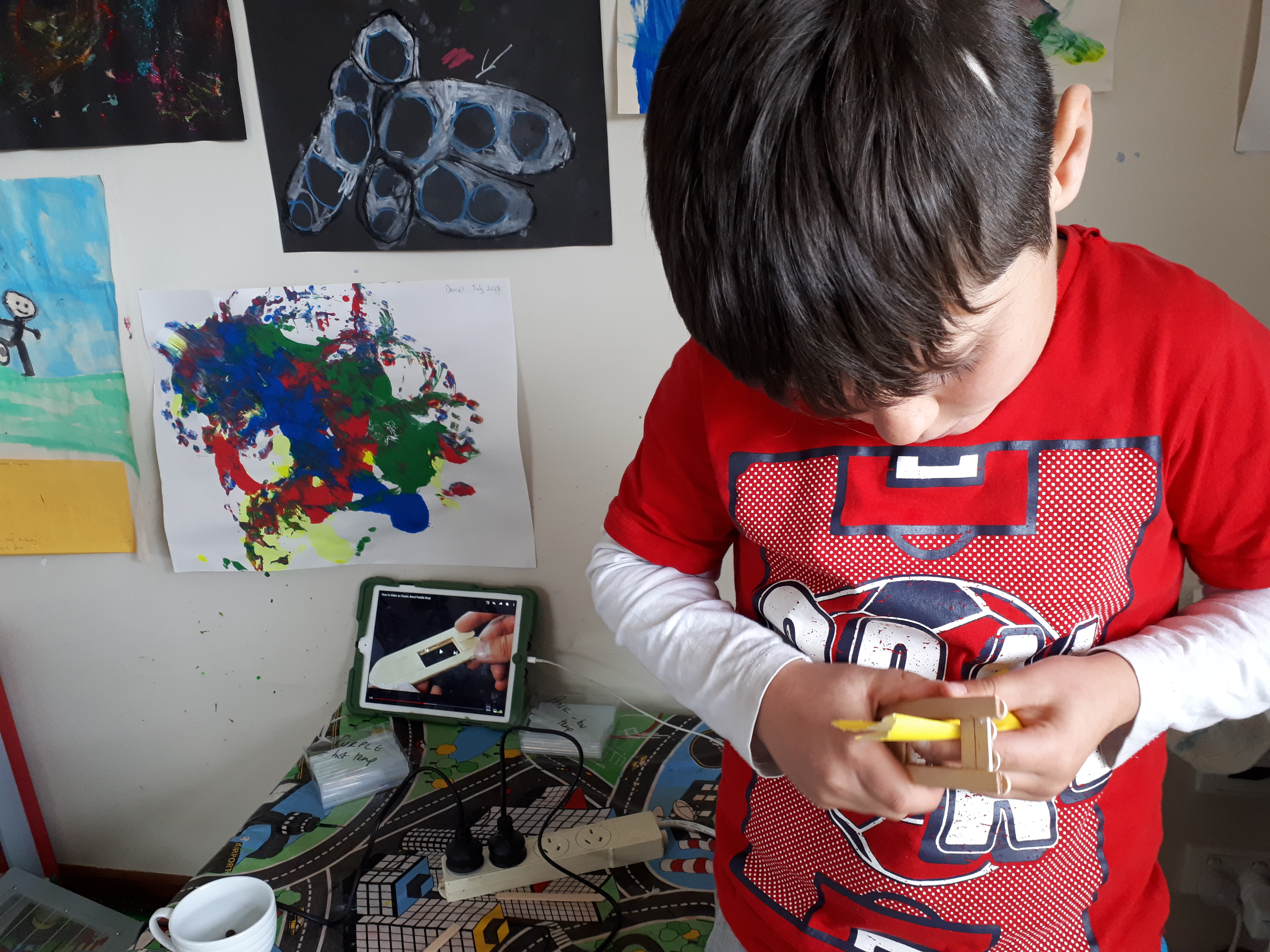 • used hot glue gun and lolly sticks to make boats (copying a youtube video). Alex was scared to make a mistake so I did a lot of the shaping. Alex tried it out in the bath later – it moved for a while but eventually the glue came apart.