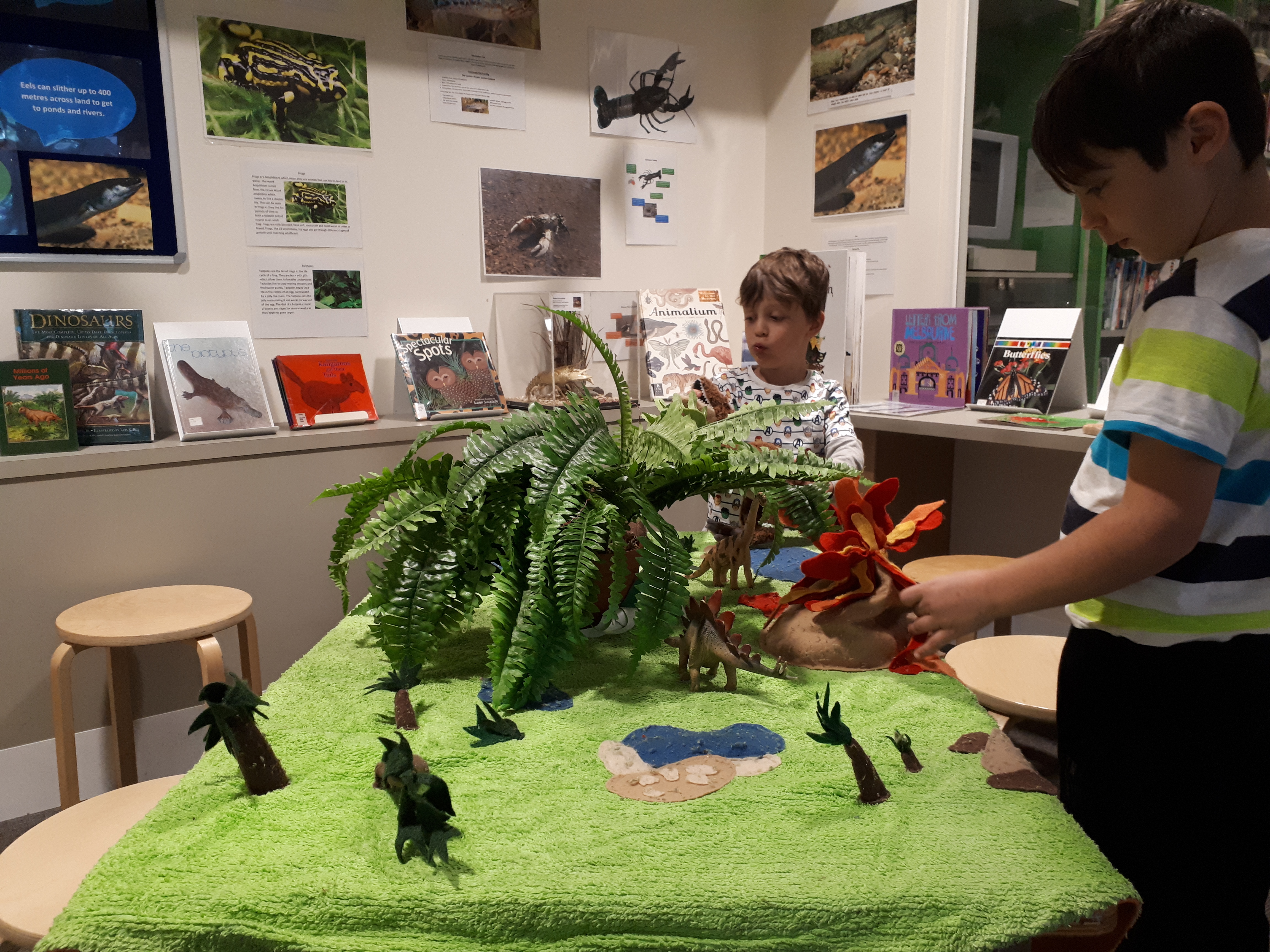• Visited museum. Kids went to Discover Centre to find the peregrine falcon. We had a look at a few fossils too. We went to bug lab. At the entrance there was a slide. Alex noticed a laser detector on the slide that triggers a fart noise, and tried to go down the slide avoiding it. inside the lab was cool. There were videos about various bugs. they really enjoyed the buzzer response test and wind tunnel testing. It was unfortunately a bit busy. We went to the main part of the museum as the kids wanted to see Phar Lap. We watched a video about him, the kids were fascinated by the story and couldn’t believe that someone would poison a horse. Daniel loved watching some indigenous songs with accompanying videos. We went to the giant squid. Daniel asked how someone could have killed him when he has such giant testicles! So funny. Finally to the children’s gallery -Alex made butterflies whilst aniel watched more indigenous stories. Then we played outside.