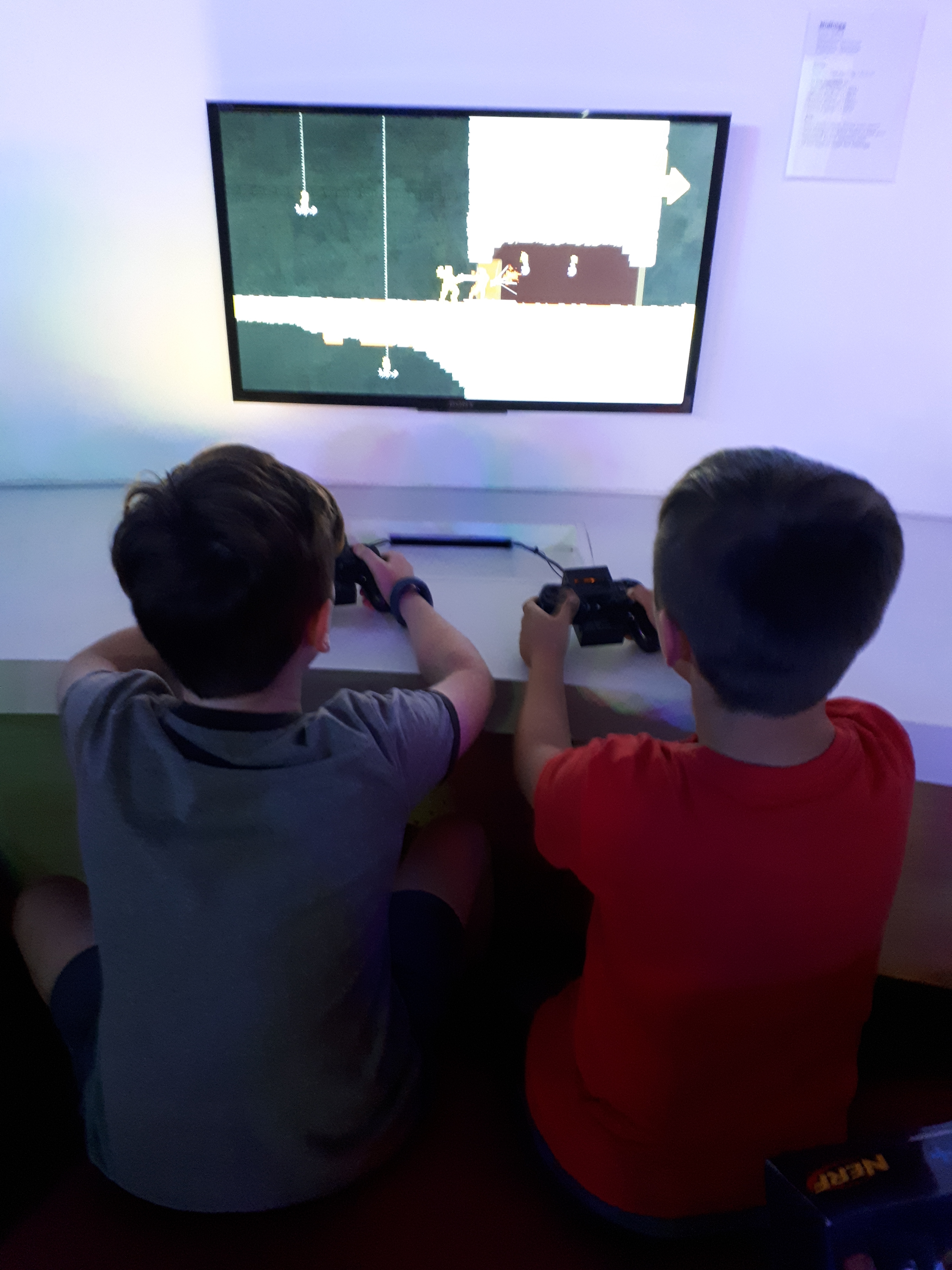 Went to city but the kids not keen on queues so we avoided Myer and SantaLand. Took pics ArtVo style in crown. Craig bought kids nerf guns for Christmas and we showed him around ACMI. Alex befriended another kid, again, on the consoles.